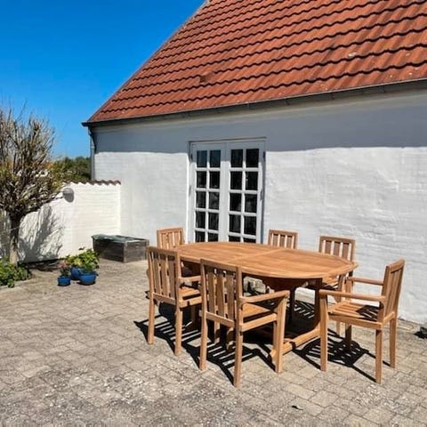 Selvfølgelig lavet af teaktræ så den kan holde til at stå ude i det danske klima året rundt uden nogen form for vedligehold af nogen art