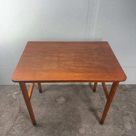 funktionelt skrivebord udført i massiv teak. Bordet er let slebet og olieret. Standen er god med almindelige brugsspor.