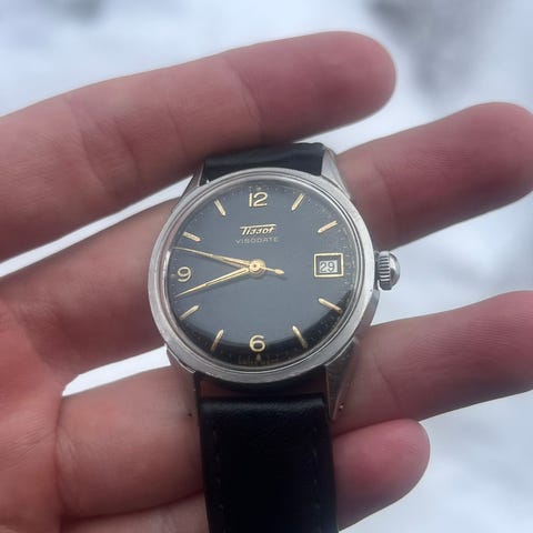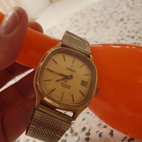 Et flot og unikt Tissot ur med en gylden skive der er meget sjælden, uret er af 14K guldbelagt stål og er samlet set i rigtig flot stand. Kronen er ovenikøbet en meget fin blå sten og det er den originale lænke der er påsat.