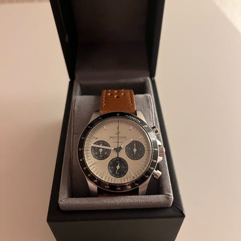 Sjældent og specielt ur uden timeviser på 3’er og 9’er position, hvilket man ikke ser ofte. Uret har en fin hvid skive og guldbelagt stål urkasse. Den kommer derudover også med en helt ny læderrem.