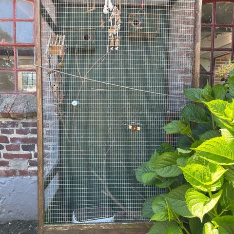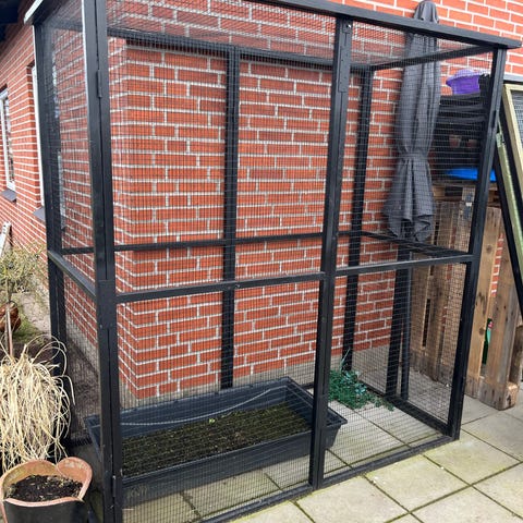 Der er udtræksskuffe i bunden samt siddepinde inde i volieren.