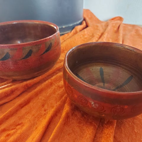 Træskål drejet ud af sammensatte stykker tømmer, hvilket giver en smuk effekt.