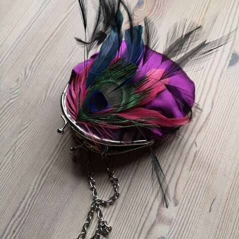 Anden taske, Lille fin håndlavet taske til en festlig aften eller blot til pynt. Tasken er foret og har påfuglefjer som dekoration.