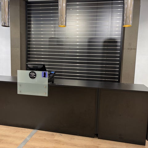 Udført i lys grå laminat med top i robust egelaminat, brugt i møbel butik, der er forberedt til kabelføring (rør medfølger ikke)