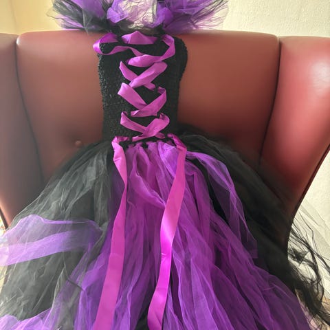 Brugt en gang til fastelavn, som ny i sort og flot postkasserød med bjælder på blusen. Bukserne har elastik i livet.