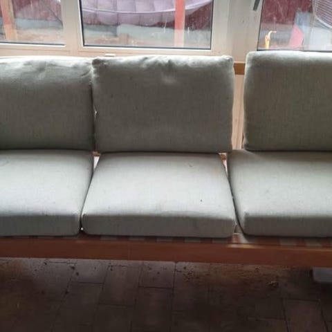 3 Pers. Fin stand. Betrukket med smuk olmerdug i uld. (Sofabord kan medfølge gratis). Kan leveres i Randers/Århus