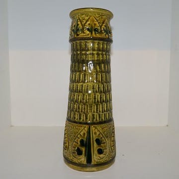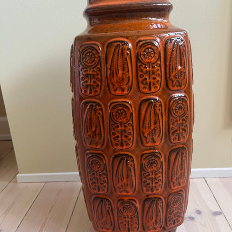 "Knoppvase", keramik, VEB Haldensleben 1960'erne-70'erne, Basisglasur er semi-mat orange, beklædt med en mørkebrun glasur, som forstærker reliefeffekten af de orange knopper/knopper på de to sider.