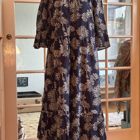 Kjole Bonaparte str. M 40 tynd sommerkjole, hvid med blåt mønster og med elastisk bærestykke. 100% bomuld. Fin stand, nærmest som ny. Ann. nr. V33