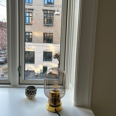 Amp er en elegant og storslået bordlampe med en marmor- eller messingfod, der bidrager til dets luksuriøse udtryk. Takket være den store kop i farvet glas spreder lampen et dekorativt lys i alle retninger.