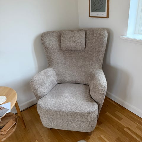 ByLassen Ingeborg stol + skammel i beige sacho zero tekstil.