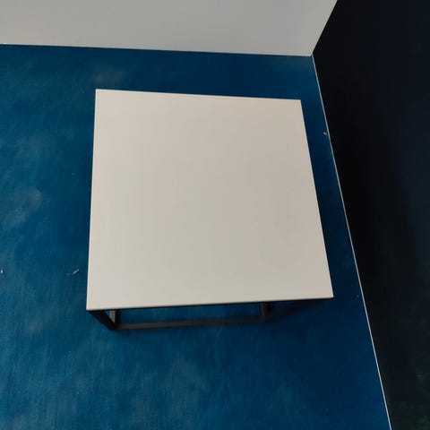 Kvadratisk sofabord i lysegrå laminat og sortlakeret metalstel.