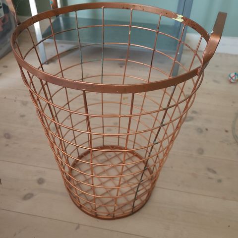 1 stk. Super dekorativ kurv i kobber med 2 håndtag. Mål: Ø: 34,5cm. H: 31,5/med håndtag: 36,5 cm. Kurv brugt til pynt men også på værelse til tæpper/puder opbevaring. Pris -100 kr.
