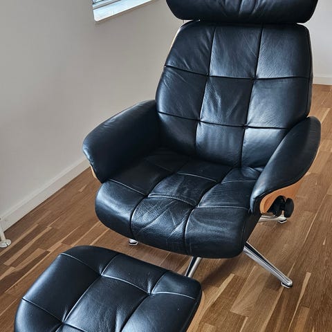 FLEXLUX Aarhus lænestol med dreje- og vippefunktion. Monteret med 0964 Semianilin læder. Polstring i formstøbt koldskum. Sokkel i poleret aluminium. Dynamisk justering af ryglænsvinklen og justerbar nakkestøtte sikrer optimal ergonomi.