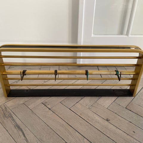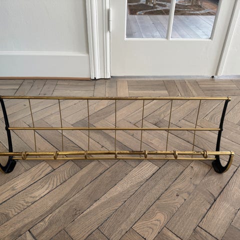 Smuk gammel hattehylde i lækker patineret messing, med sorte dekorationer.