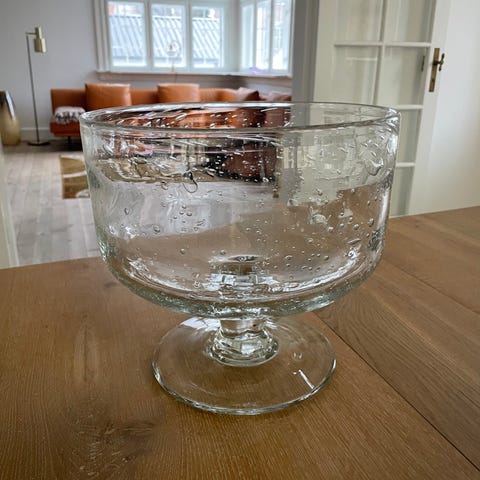Det kan du nemlig med denne skønne glasskål med fod som måler hele 27cm i diameter og 25cm i højden. Der er plads til pænt meget frugt.