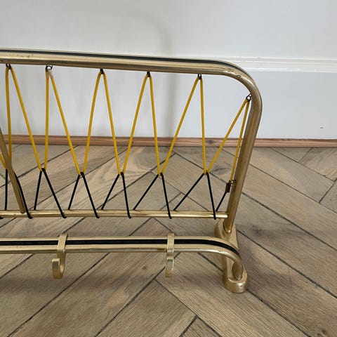 Messingbelagt hattehylde med tophylde i gul / sort plastsnore og en sort kant.