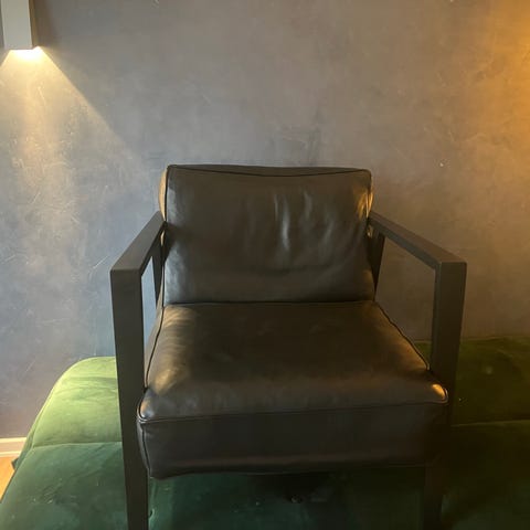 Klassisk lav lænestol i sortbejdset træ med super blødt ægte okselæder i fineste kvalitet over alt