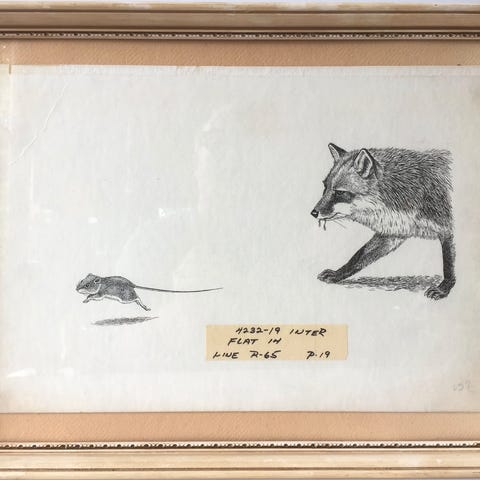 Satirisk tegning med larver i vindue. Signeret og dateret Odum '88. Tusch på papir. I ramme af aluminium. 25 x 36 cm. Ramme 35 x 45 cm.