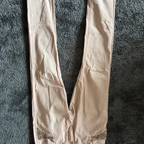 Virkelig flotte bukser, brugt en gang og som nye, alle perler sidder fast som de skal. Flot detalje ved skinnebenet, hvor der er blondestof med flere perler se billedet 3.