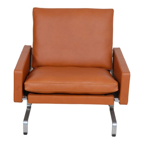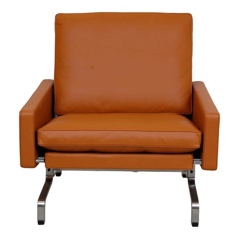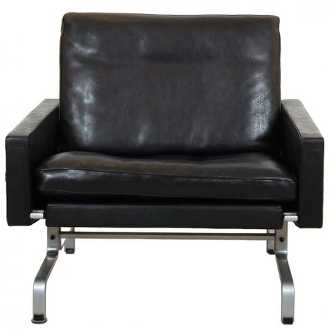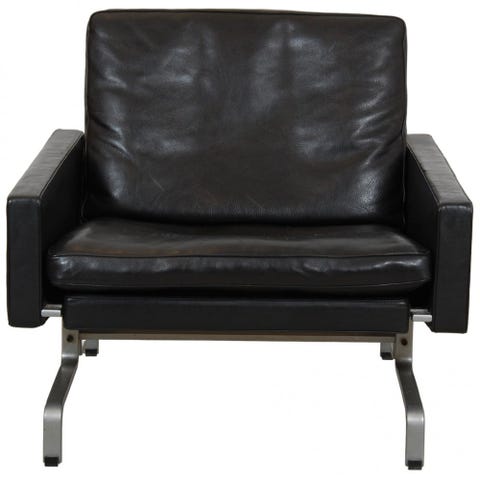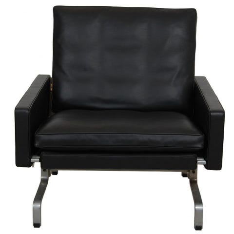 Poul Kjærholm PK-31/1 lænestol betrukket med sort aura læder, og med stel af stål. Stolen er fra 1999 og fremstår i pæn stand, dog med let patineret læder, og med let rust på stellets underside.
