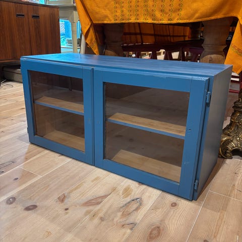 Lille skab, med glas på låger og i siderne.