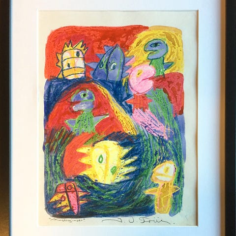 Komposition med fabeldyr. Signeret og betitlet J. U. Friis, “Gespenst”. Akvarel og blyant på papir. Med passepartout og sort ramme. Lysmål 29 x 39 cm (ramme 42 x 52 cm). (J18)
