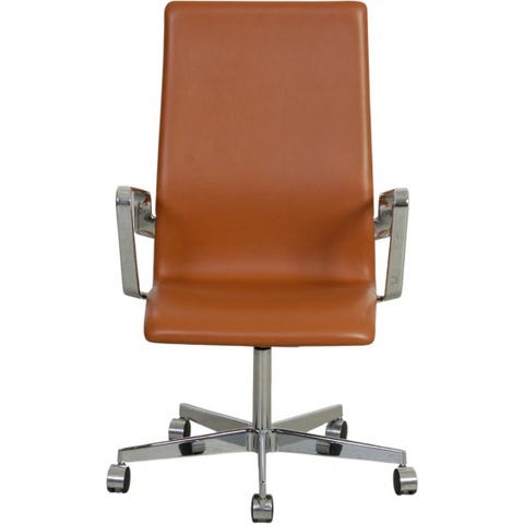 Arne Jacobsen høj Oxford kontorstol, som er nybetrukket med nyt skum og walnut farvet anilin læder. Stolen er fra 2008, og fremstår i god stand med bløde hjul til hårdt gulv, samt med højde justering og vippe-funktion.