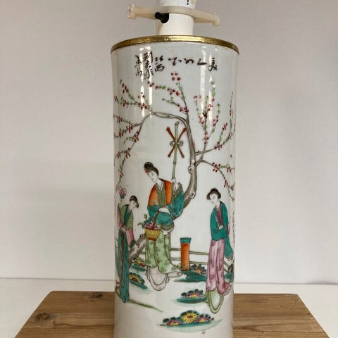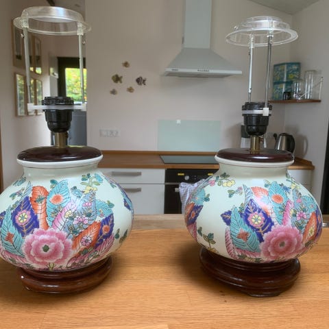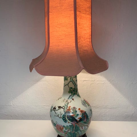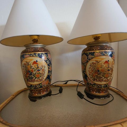 2 smukke kinesiske lamper, malet med blomstermotiver, med hvid skærm.