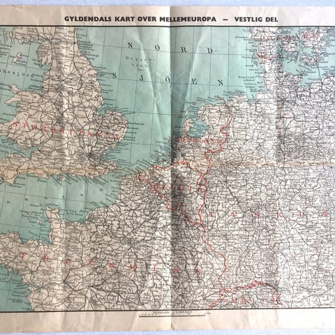 Gyldendals kort over mellemeuropa - Østlig del. Sammenfoldelig. Skala 1 : 2300 000. Med brugspatinering. Med folder, se fotos. 52 x 62 cm.