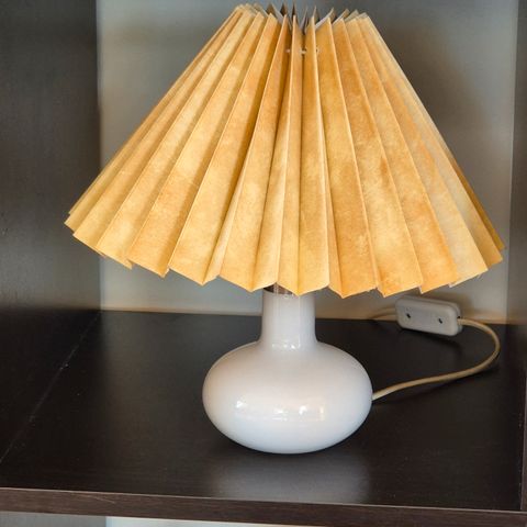 Bordlampe af opaline glas med messing montering og LED pære. Højde i alt 56 cm. Rør længde 26 cm. Diam. 6,2 cm. Skærm Diam i nederste kant 32,3 cm. Monteret med cirka 150 cm plast ledning.