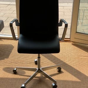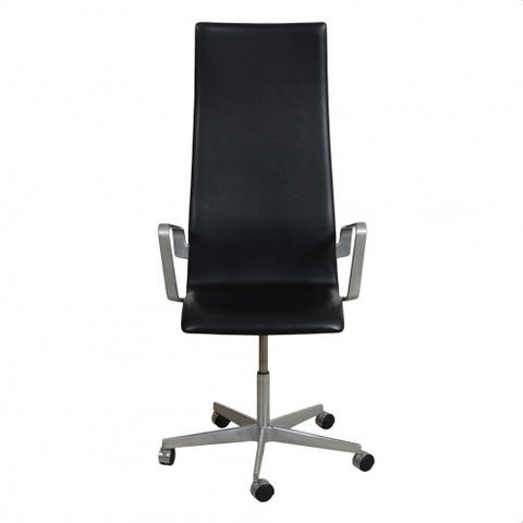 Arne Jacobsen højrygget Oxford kontorstol betrukket med gråt læder, og med 5-stjernet drejefod af poleret aluminium. Stolen er fra 2012, og fremstår i pæn stand, med let patineret læder, og med et par mærker på armlænene. Med vippe-funktion og højdejustering