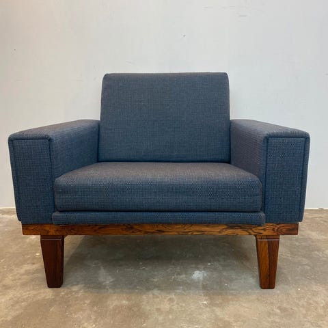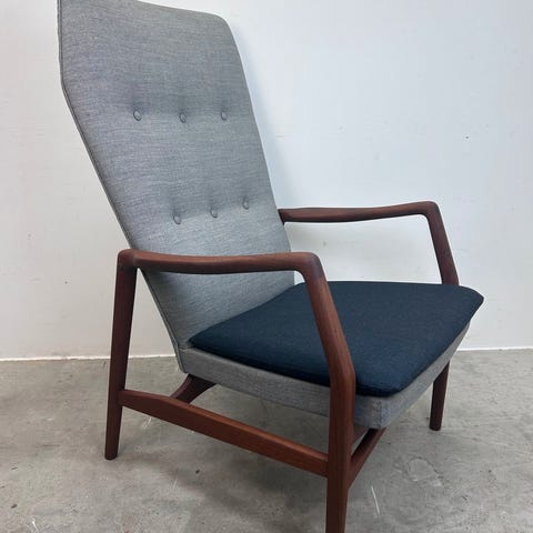Dansk møbelarkitekt lounge stol med stel i massiv teaktræ .