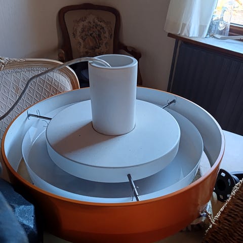 Minimalistisk og enkel loftslampe, af Hans. J Wegner for Louis Poulsen, flot til det skandinaviske enkle spisebord. Ægte dansk design ikon. Skærm har aldersrelateret brugsspor.