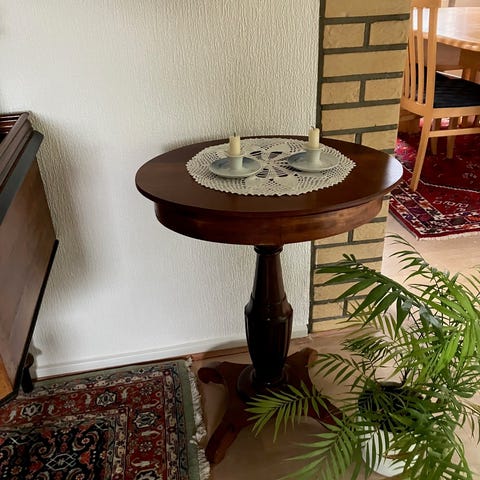 Smukt senempire bord, med klapper og intarsia-arbejde på skuffe og bordplade, lavet i 1840'erne.