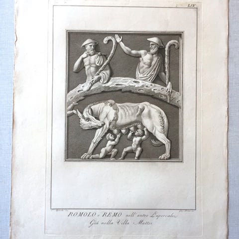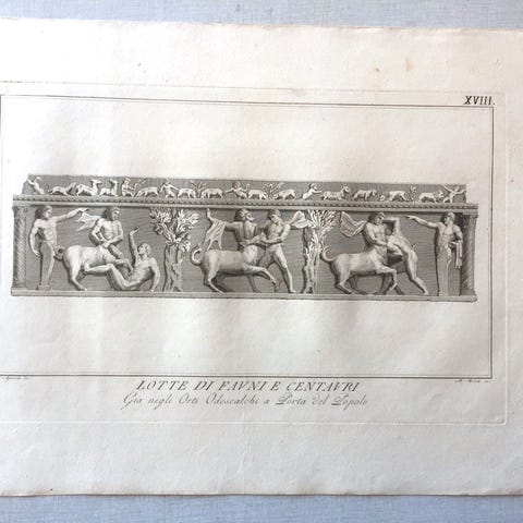 Tryk med klassisk frise scene i form af kæmpende kentaur, efter Luigi Agricola. Signeret Al. Mochetti inc. Blad 43 x 60 cm. Trykplade 31 x 48 cm. Uden ramme.