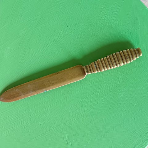 Retro brevåbner sæt i læderetui, Der er her tale om et flot retro messing brevåbner / brevkniv og saks sær i tilhørende læderetui.
