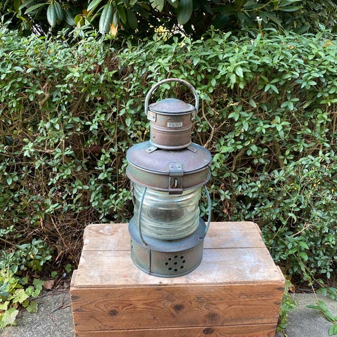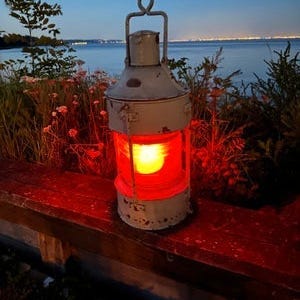 Toplanterne/ankerlanterne,hus i svær aluminium med rødt glas,monteret til el.