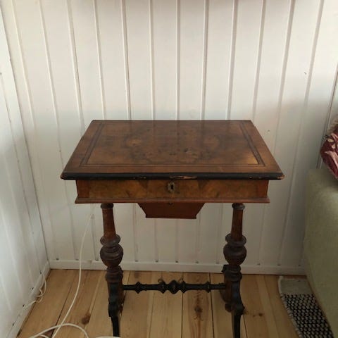 Har skuffe under bordet, samt bordklap, hvorunder der forefindes 11 små rum, med separat låg til hver.