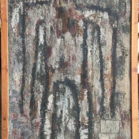 Komposition med hoveder. Utydeligt signeret og dateret '90. Olie på pap, indrammet bag glas. 99 x 70 cm. Ramme 124 x 94 cm.