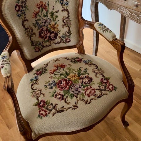 Udført i mahognitræ, og betrukket med jacquard-vævet stof, i sart grøn farve, på sæde og skammel.