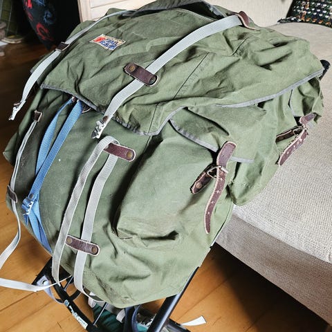 rygsæk. Fjälrräven / fjeldræven taske i kaki farvet tekstil. Med lidt pletter omkring bunden. Mål uden stropper: H. 33. B. 30. D. 14 cm.