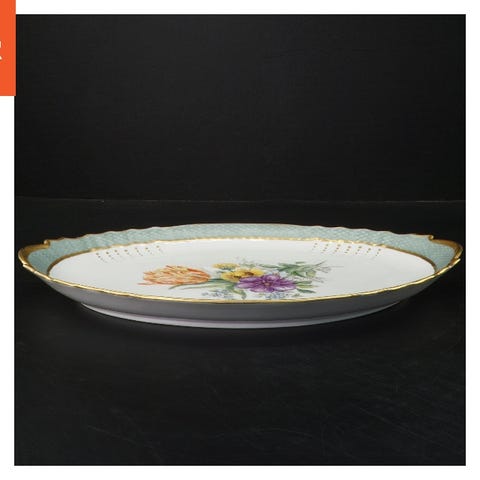Gammelt super dekorativt porcelæns bladfad med hank og guldkant og håndmalede blomster.