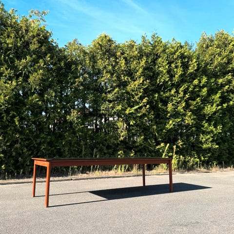 Stand: Bordpladen er nyrenoveret. Ellers med aldersrelateret brugsspor (antagelig fra 60'erne) i form af patineret læder og træet er med overfladiske skrammer og mindre afslag.