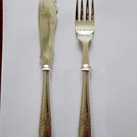 Et sæt fiske bestik af sølv, bestående af 6 fiskeknive L. 21,5 cm., og 6 fiskegafler L. 18 cm. Stemplet 800, 1. AL. Tyskland, midten af 1900 tallet. Samtlige dele i fin stand. Sælges kun samlet. Vægt i alt 698 gr.