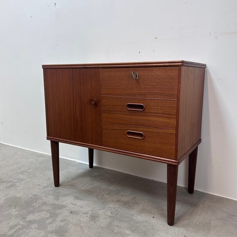 Kai Kristiansen skænk i fineret og massiv teak med skydelåger, indvendig med hyldeindretning og skuffer