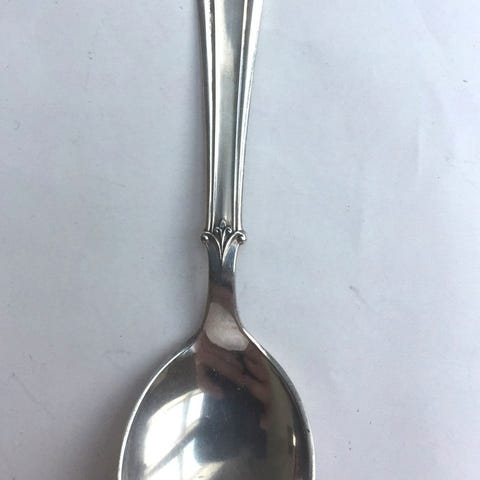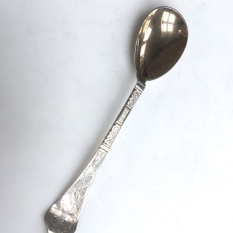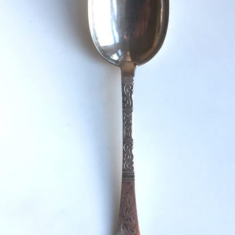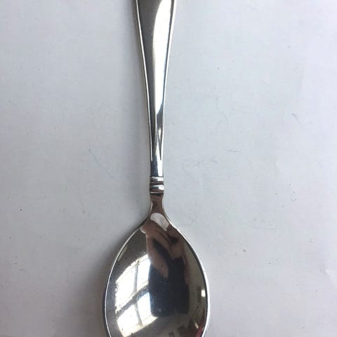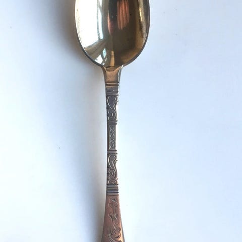 Art Nouveau kompotske af tretårnet sølv. Ubekendt mønster. År 1918. Stemplet AT, muligvis A. Tvenstrup, Randers. L. 13,8 cm. Vægt 17,3 gr.