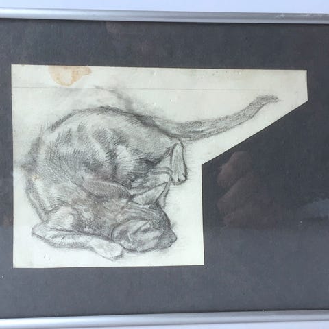 Kat. Usigneret. Tusch og blyant på papir. Med ramme af forgyldt træ. Ark mål 12 x 23 cm. Ramme 23 x 37 cm.