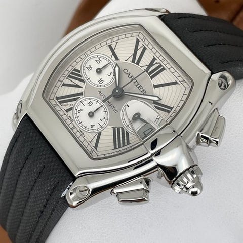 Cartier Roadster Automatic herre i super stand. Massiv guld (750). Kommer med boks, og købskvittering fra Juwelier Rieger i München. Størrelse uden krone (38x44mm). På grøn krokodillerem. Helt ny sort krokodillerem samt lyseblå gummirem følger med.