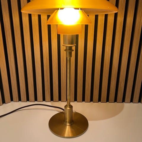 Stand: Brugt lampe, fremstår med patineret stamme af messing samt fod, alle glassene er hele og intakt. Nummerbevis medfølger.