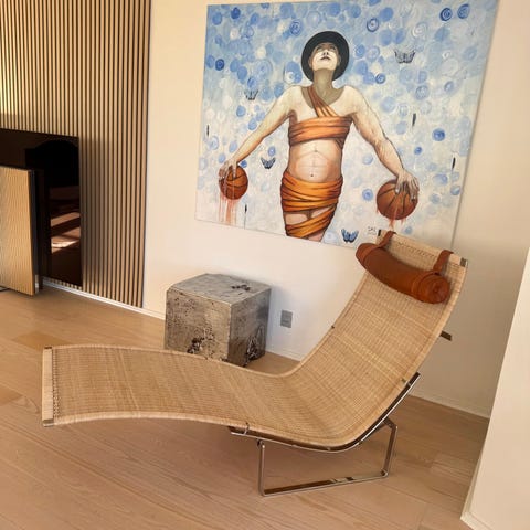 Poul Kjærholm PK24 stol betrukket med peddigrør flet, og med en nakkehynde af natur læder med patina . Stolen er fra 2010 og er fremstår i pæn stand med alt flet intakt, og med patina på nakkehynden.